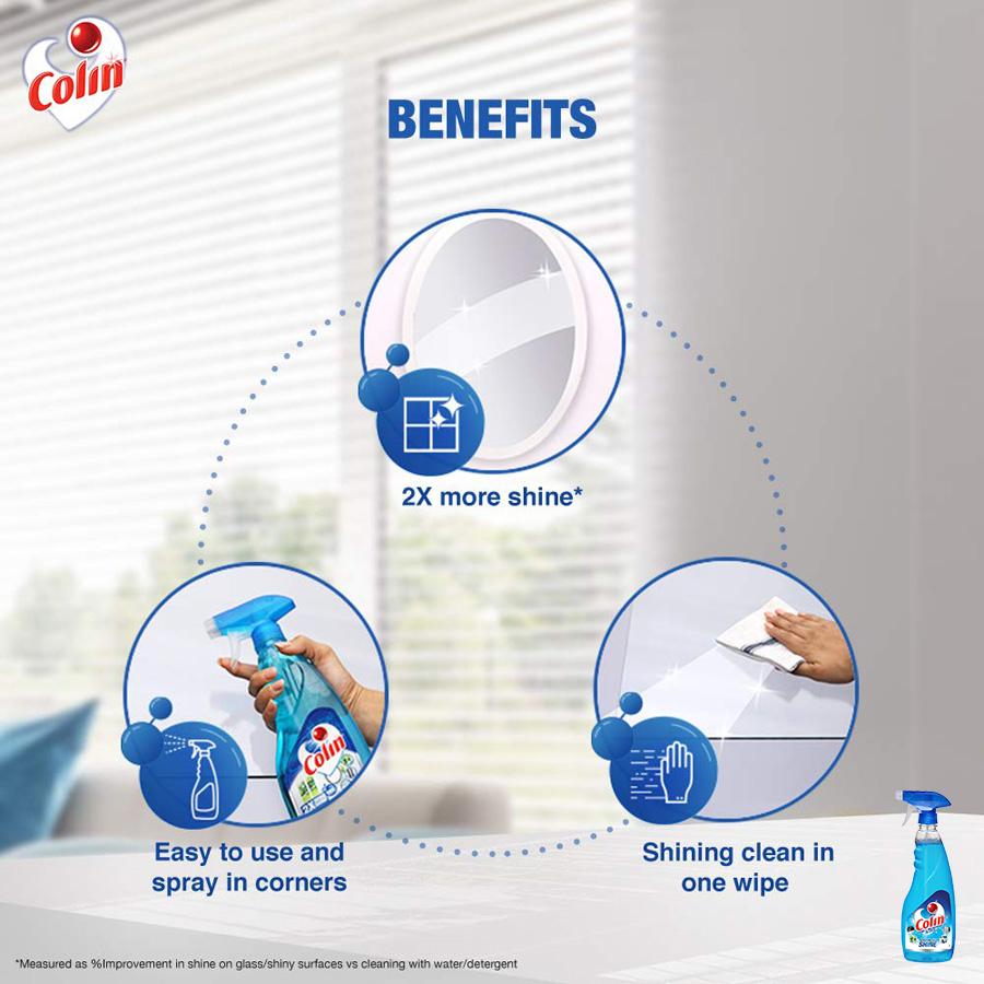- Colin Glass Cleaner Pump: The powerful formula in Colin's glass cleaner removes the dust from your surfaces and makes them spick and span. Containing the power shine boosters, it will give your glasses 2 times more shone than regular cleaners.