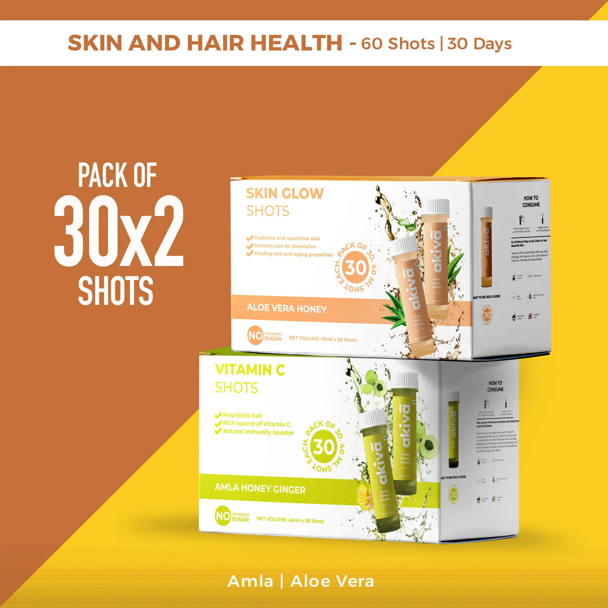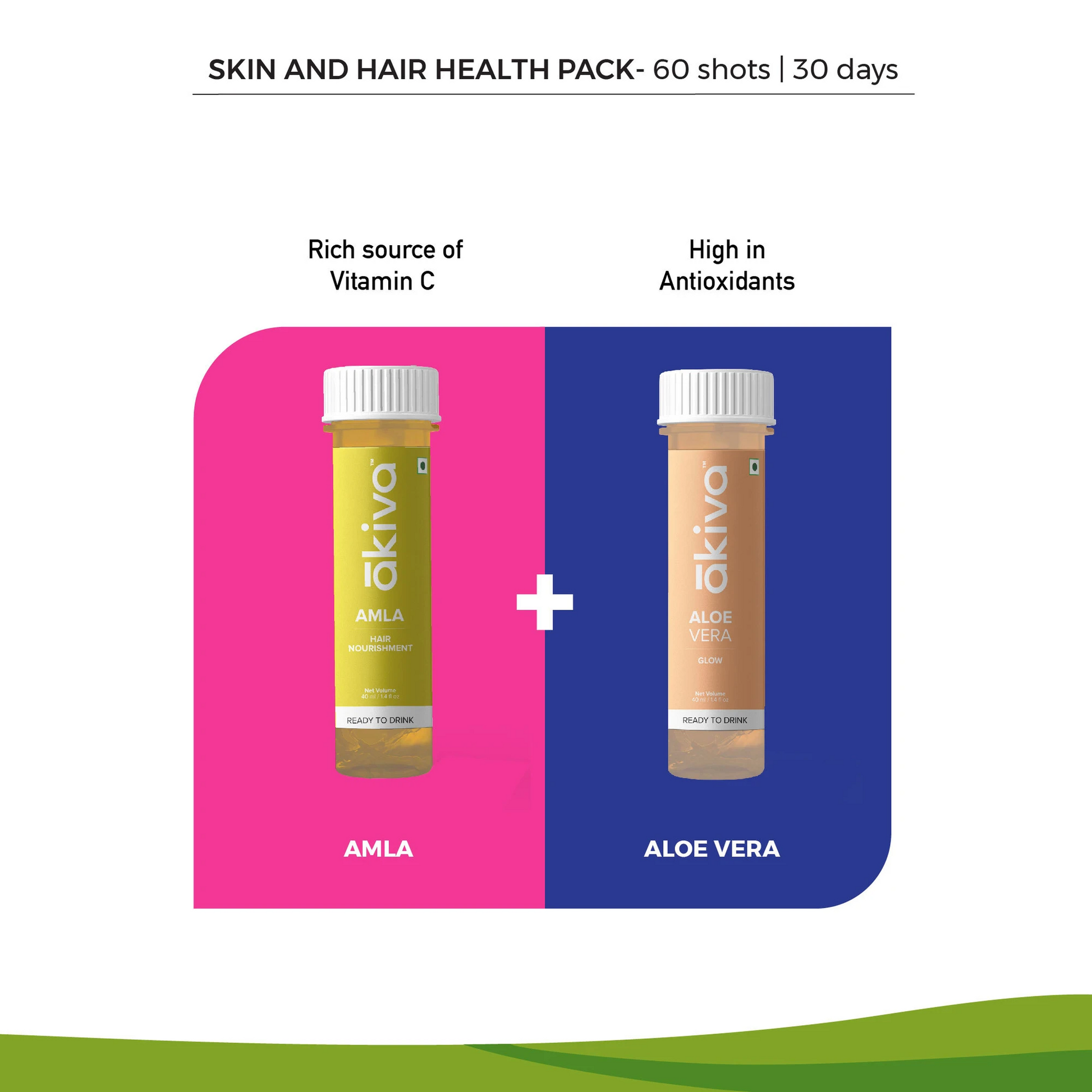 The Skin and Hair Health Pack contains 30 shots of Aloe Vera Shots rich in antioxidants that help heal the skin and keep it hydrated and 30 shots of Amla that helps get voluminous and shiny hair.